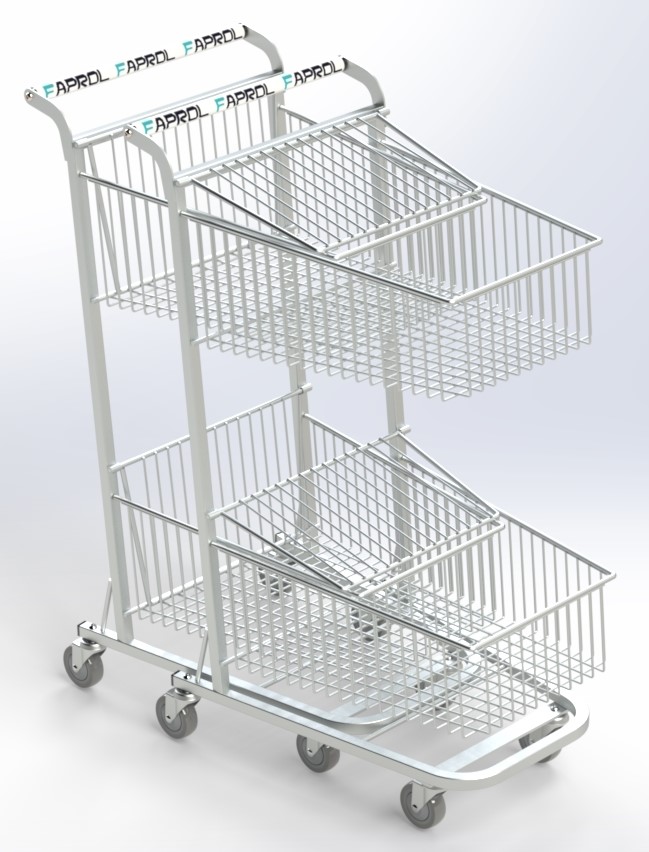 Carro 2 Cestas Encajables proporciona movilidad eficiente para transporte de artículos en áreas comerciales e industriales, con plataforma encajable ideal para Cash&Carry, mercados y tiendas de bricolaje. Carro 2 Cestas Encajables con posibilidad de mango a color o publicidad del cliente. Capacidad de carga de 30Kg por cesta.
