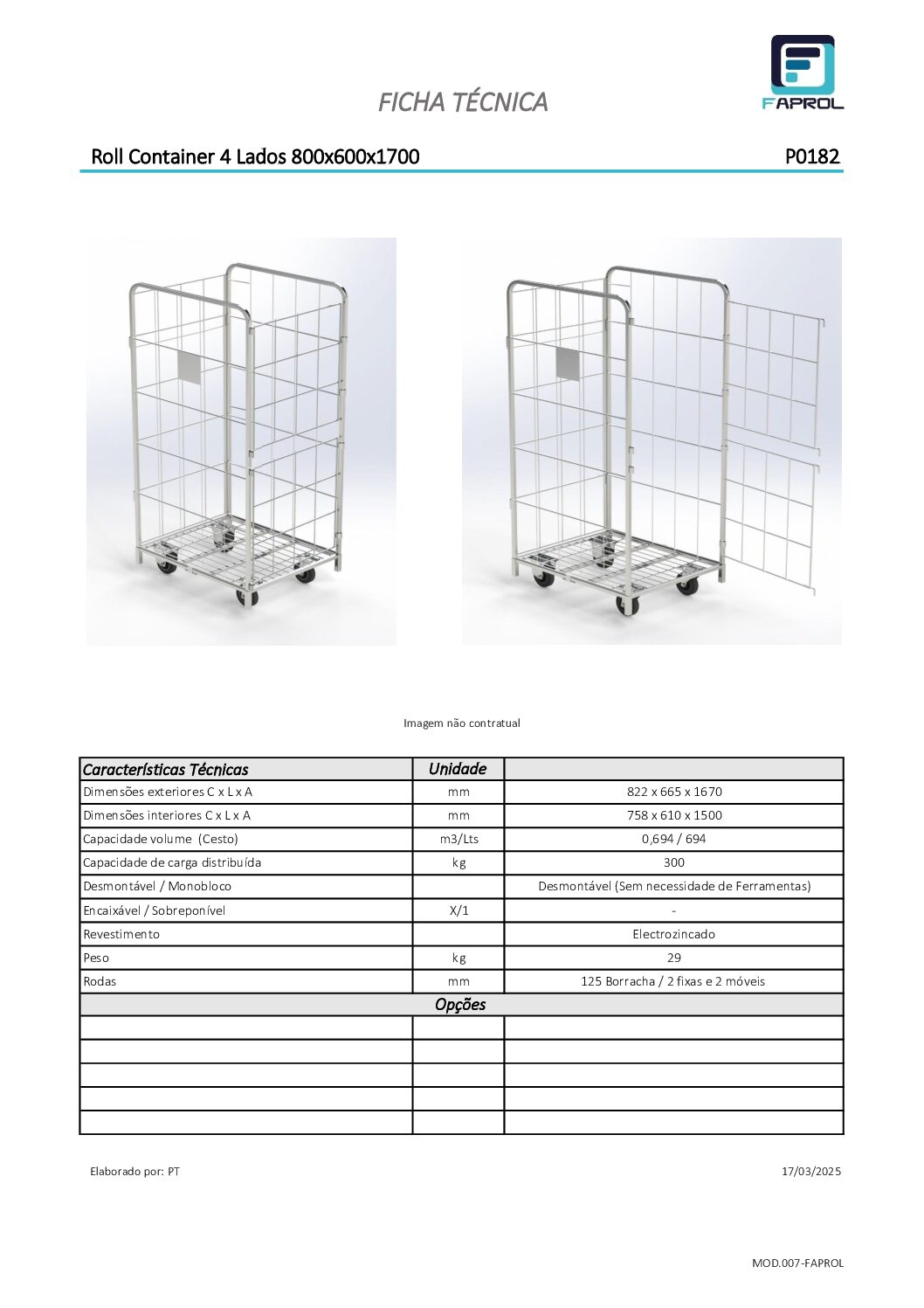 El Roll Tainer Desmontable 4 Lados 800x600x1700 mm es una solución robusta y segura para el transporte y almacenamiento de mercancías en entornos industriales y comerciales. Con una estructura de acero al carbono con acabado electrozincado, ofrece una elevada durabilidad y resistencia a la corrosión.