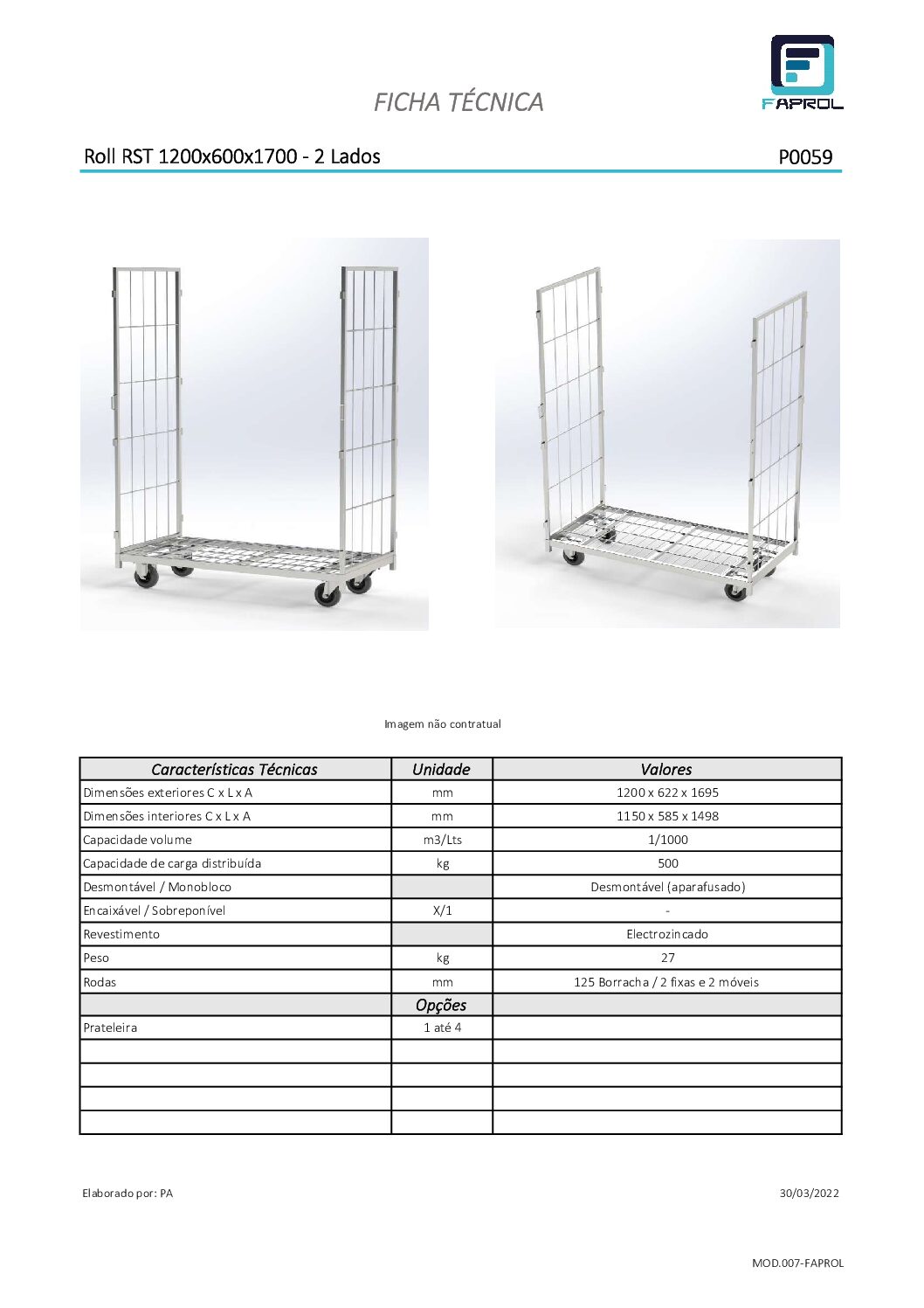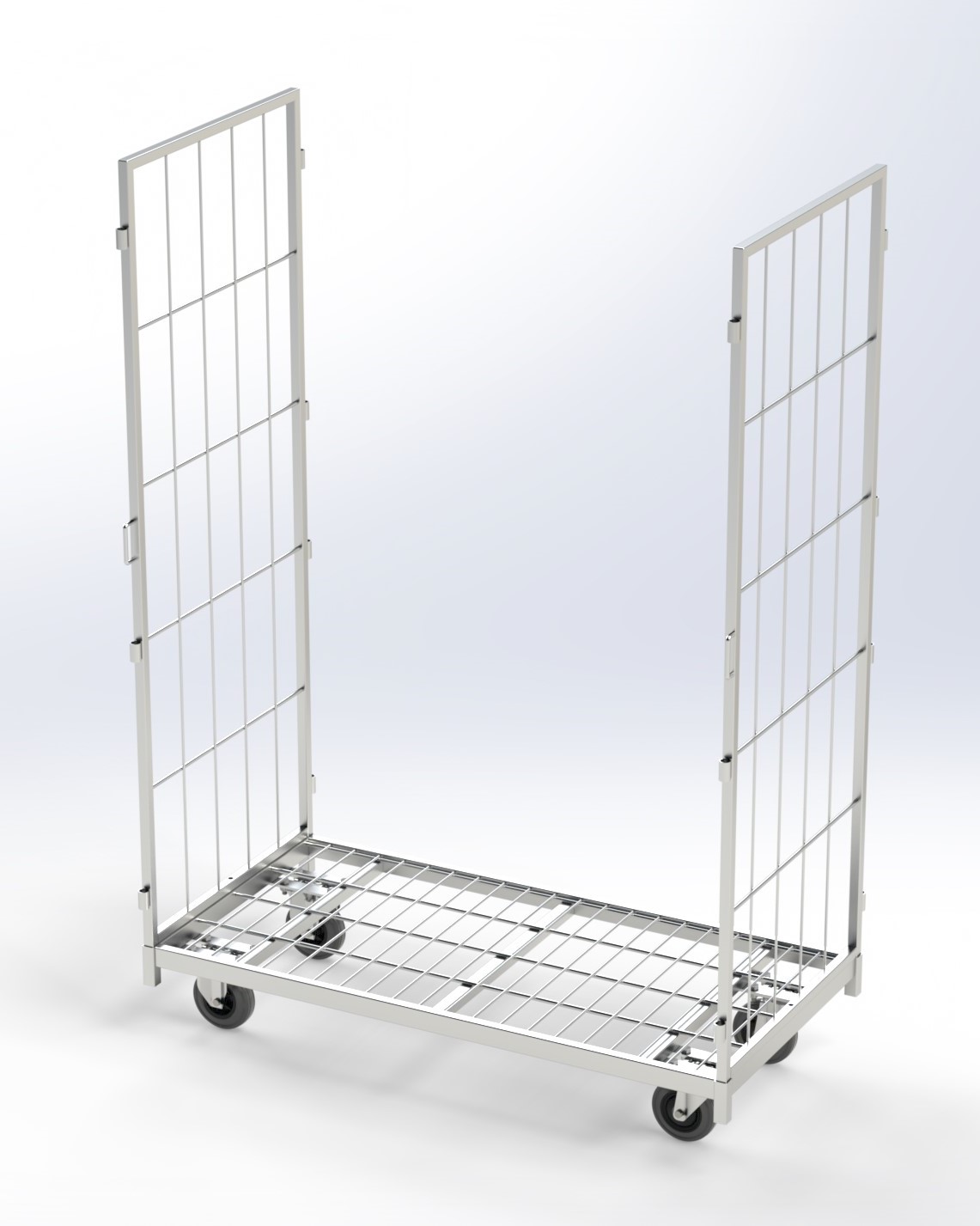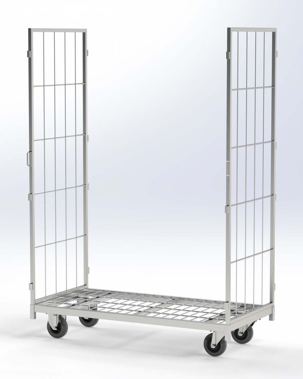 Roll Container 1200x600x1700 Roll Container compuesto de 2 caras. Este Roll Container de 600 mm de ancho y 1200 mm de largo está diseñado para transportar grandes volúmenes, con la ventaja de poder pasar por la mayoría de las puertas. La posibilidad de ser modular, con sus puertas desmontables y/o abatibles, hace que se adapte muy rápidamente a cualquier trabajo, pudiendo transformarse en un Roll con 2/3/4 lados o incluso trabajar sólo con las medias puertas. También se le puede instalar un gancho de remolque. Solicita un presupuesto: